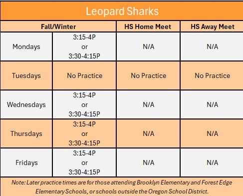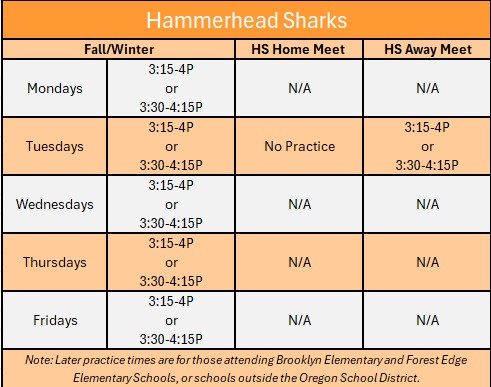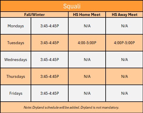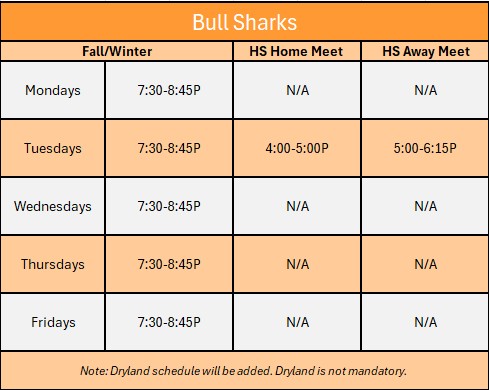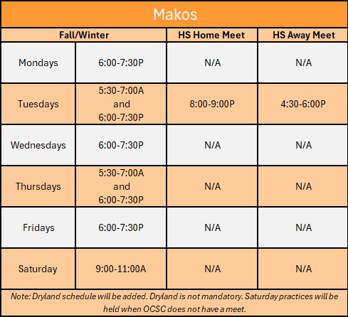 The below times are for planning purposes only and not for general daily use. For up-to-date practice times please reference the weekly e-mail from the coaches.
